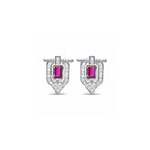 Bold ruby studs that command attention. Each earring features a striking central ruby surrounded by shimmering pavé-set stones in a geometric shield design. Perfect for those who embrace their inner strength and refuse to blend in. Available in gold or rhodium finishes.