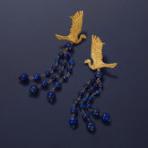 Bold and captivating, the Celestine Flight Earrings feature sculptural golden birds captured mid-flight, symbolising freedom, movement, and grace. Cascading strands of deep blue lapis lazuli gemstones fall beneath the wings, creating fluid movement and striking colour with every step.