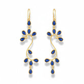 Indigo Vine captures the allure of deep sapphire and radiant gold, twisting like wild vines reaching for the moon’s glow. Each lapis petal unfolds along delicate golden tendrils, forming a timeless and striking silhouette. These lightweight earrings move effortlessly with you, embodying boldness, femininity, and freedom. Designed for the woman who dreams with bare feet yet commands every room she enters. Crafted from brass plated with 18K gold and set with sapphire stones, measuring 70mm long and 25mm wide, Indigo Vine is a statement you don’t want to miss.