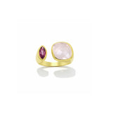 A tale of two hearts, entwined. This sculptural open ring pairs blushing rose quartz with deep berry rhodolite tourmaline — one soft, one bold — mirroring the dance between vulnerability and desire. Crafted in 925 sterling silver and finished with a luxurious 0.3-micron plating of 18K yellow gold, Lover’s Dual wraps the finger like a whispered vow — intimate, elegant, and powerfully feminine.