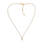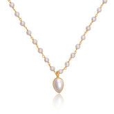 Ocean’s Grace exudes delicate sophistication, capturing the essence of the sea in every feature. A string of radiant pearls culminates in a single teardrop pearl pendant, embodying subtle elegance and gentle femininity. This necklace evokes the serene beauty of tides, moonlight, and the timeless charm of the ocean. Crafted from 925 Sterling Silver, adorned with Freshwater Pearls, and finished with an 18K Yellow Gold plating.