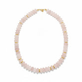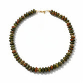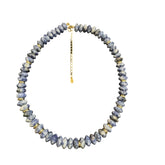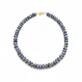 Indulge in the exquisite beauty of the Odette Necklace, a handcrafted statement piece adorned with stunning semi precious gemstones and accented with gold plated discs.