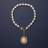 Elegant and luminous, the Palais Lumière Necklace features a strand of softly glowing baroque freshwater pearls, each uniquely shaped and full of natural character. Suspended at the centre is an ornate pendant framed with delicate pearls and finished with a luminous central stone, creating a striking focal point of refined beauty.
